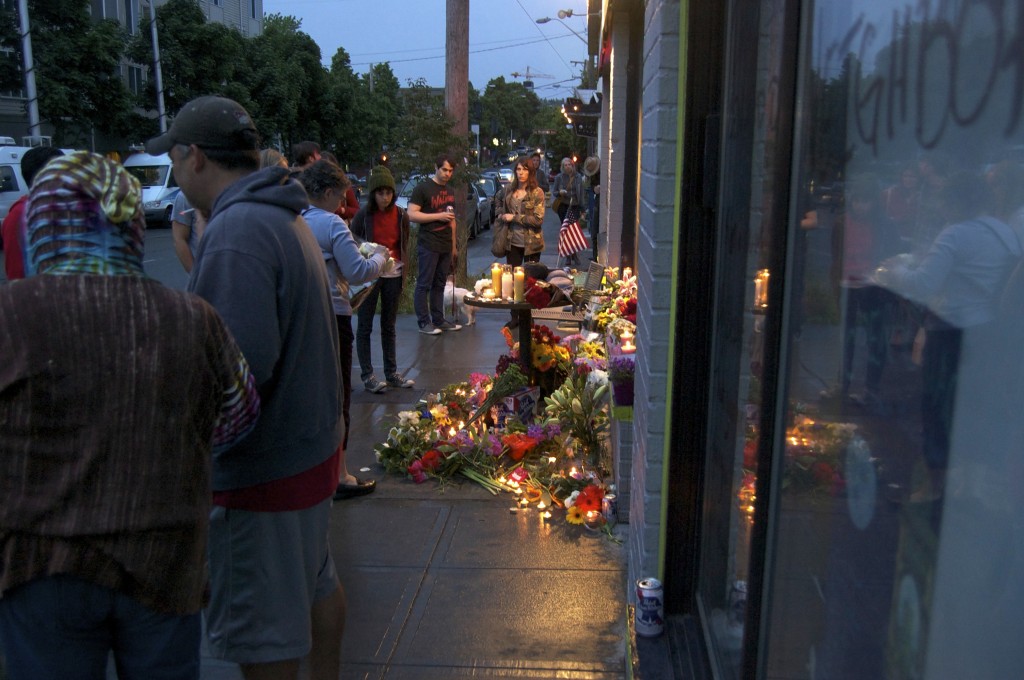 Last night, as people started to gather at Cafe Racer (5828 Roosevelt Way NE) to mourn and to celebrate, we asked one of our Ravenna neighbors, Steve Sorbo, if he wouldn’t mind heading over there to take some pictures and share the experience. (Steve also worked with us on the Steve Jobs tribute posts last October.)