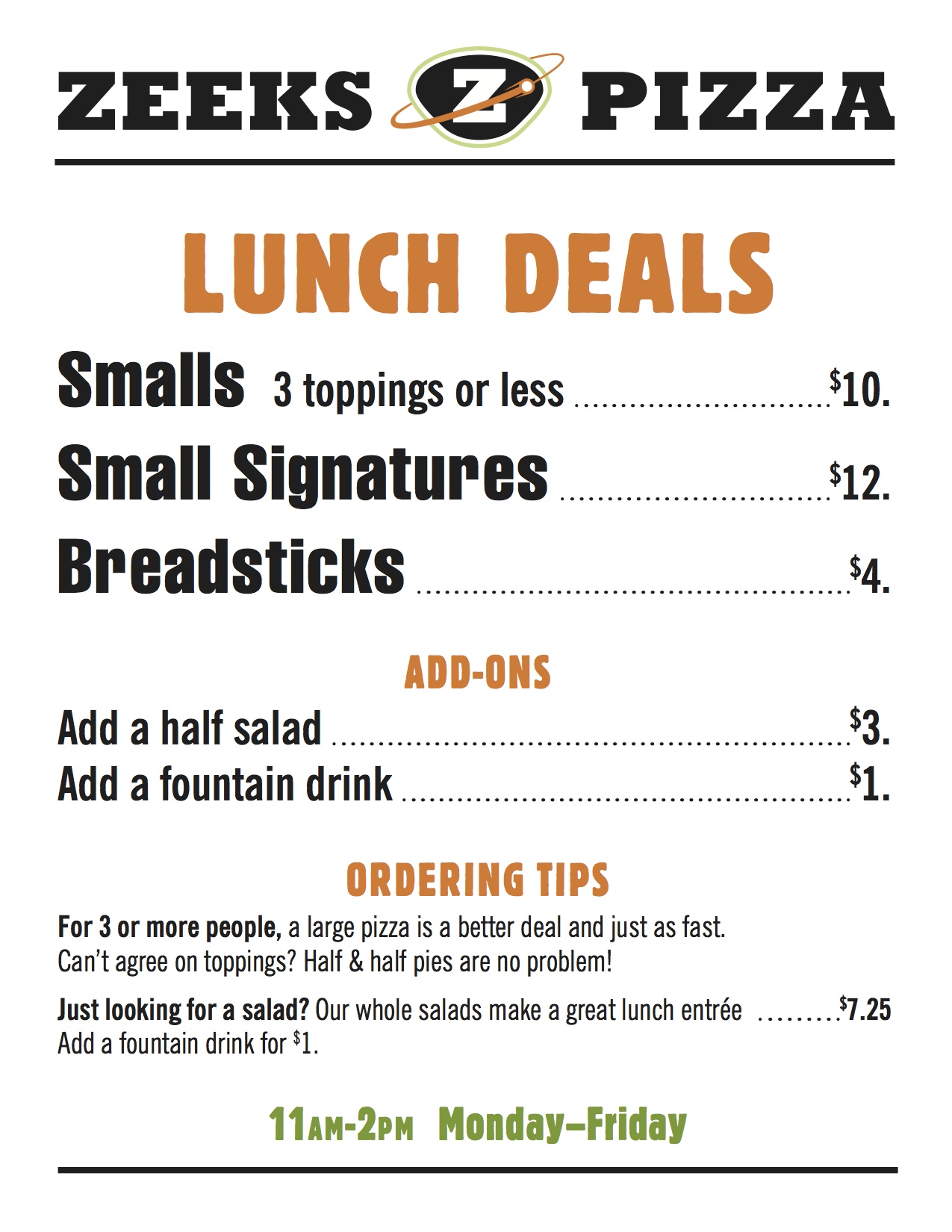 HOWEVER, starting Wednesday, May 7, our Zeeks on 65th will start offering special lunch deals on weekdays, from 11 AM to 2 PM (dine-in only):
